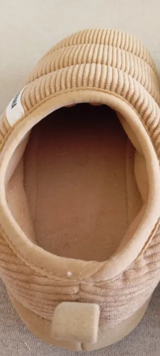 Comodísimas zapatillas de estar por casa con un diseño acolchado. - Suela de goma con relieve antideslizante. - Material exterior textil. Interior polar muy calentitas.talla del 36 al 38 .Yo uso el 39 y me vienen justas ,Me las regalaron para navidad y perdí el tiquet, creo que costaban 29,95