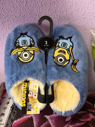 Zapatillas de casa de felpa con diseño de Minions. - Color azul con detalles amarillos. - Estan nuevas, sin estrenar. - Talla 35.