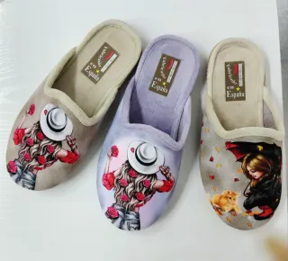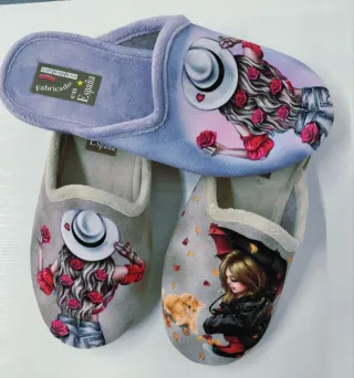 Conjunto de zapatillas de casa con diseños originales. - Estampado de chica con rosas y sombrero. - Estampado de chica con paraguas y gato. - Fabricado en España. Tengo varios números, pregúntame por el tuyo