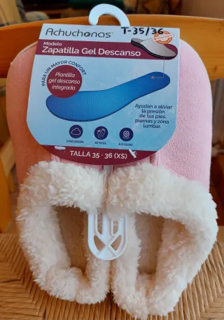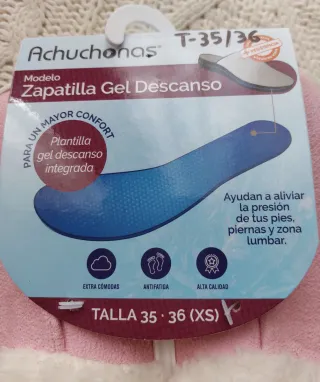 Conservan las etiquetas marca Achuchonas Ayudan a aliviar la presión de tus pies, Antifatiga de piernas y zona lumbar La plantilla es de gel descanso Talla 35/36 (xs) Suelas Antideslizantes Extra cómodas Alta calidad Sensación de confort total Interior forrado con borreguillo, muy calientes Absorven los golpes que reciben los pies Precio inicial 19'99 € Hechas en España