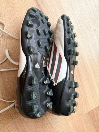 Zapatillas de fútbol Adidas con tacos para césped. - Diseño en blanco y negro. - Tacos de goma verde. - Logo de Adidas en la lengüeta y el talón. Las compro para un 43, pero le quedan pequeñas, recomendamos que sean para un número 42, o 42,5. Usadas en 2 entrenamientos y un partido.