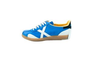 Zapatillas Munich modelo Gresca en talla 42. Combinan azul y blanco con detalles en verde y suela de goma. Míticas zapatillas de fútbol sala. Ideales para vestir - Diseño deportivo. - Cierre con cordones. - Logo de Munich en el lateral.