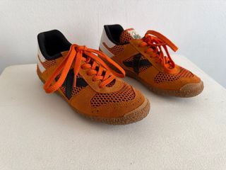 Zapatillas de fútbol sala Munich en talla 35. Diseñadas para ofrecer comodidad y rendimiento en la pista. - Exterior de malla transpirable. - Detalle de la marca en los laterales. - Cordones naranjas. - Suela de goma adherente. Como nuevas, solo usadas una vez