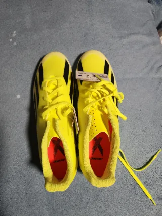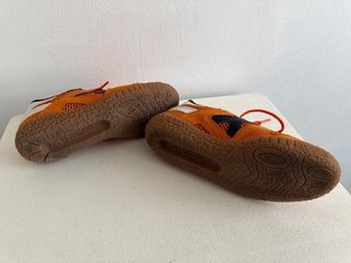 Zapatillas de fútbol sala con un diseño moderno y llamativo. - Suela de goma para un buen agarre. - Sin estrenar , sólo 2 min para darnos cuenta de que le están pequeñas 😞😞 - Interior naranja.
