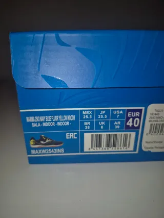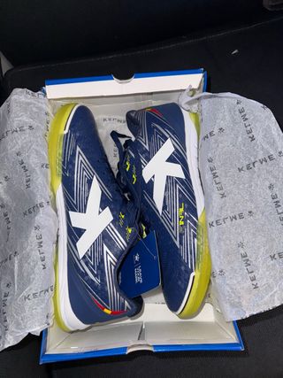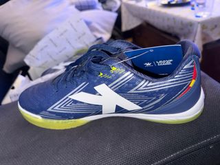Zapatillas de fútbol sala con un diseño moderno y llamativo. Se venden por ser un regalo repetido. Sin estrenar. - Parte superior en azul con detalles plateados y amarillos. - Suela de goma para un buen agarre. - Cierre de cordones.