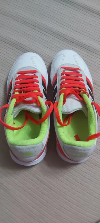 Vendo zapatillas deportivas Adidas para fútbol sala con un diseño llamativo del número 35. - Exterior blanco con detalles en rojo. - Suela de goma para un buen agarre. - Cordones rojos vibrantes. - Forro interior en color verde neón.