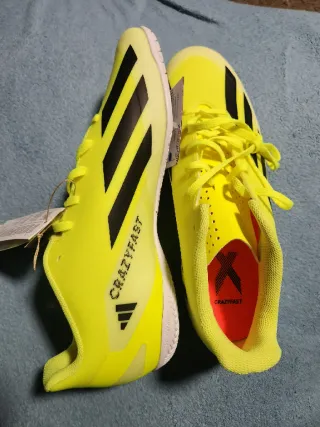 Zapatillas de fútbol sala Adidas en llamativo color verde aunque se ven amarillo neón con detalles en negro. Diseñadas para la velocidad y el control en la cancha. - Modelo CRAZYFAST. - Diseño con las icónicas tres franjas de Adidas. - Suela de goma para un agarre óptimo. - Interior con plantilla naranja y logo X CRAZYFAST.