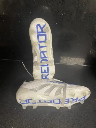 Zapatillas de fútbol Adidas Predator Elite con lengüeta en color blanco con detalles azules. Seminuevas. Talla 44 2/3. - Parte superior con textura. - Suela para césped artificial o natural.