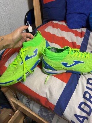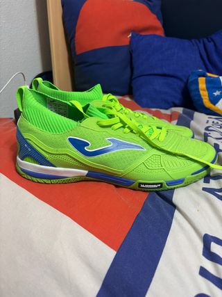 Zapatillas de fútbol sala Joma en llamativos tonos verdes y azules. Diseñadas para un buen agarre y comodidad en la cancha. - Parte superior de malla transpirable. - Suela de goma duradera. - Detalle de logo en el lateral. Apenas tienen uso me las regalaron y uso otras