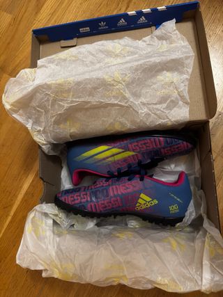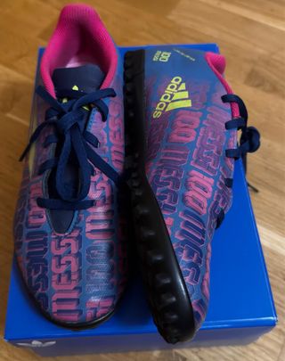 Zapatillas de fútbol multitaco Adidas, con un diseño llamativo. Están nuevas como se puede apreciar, solo utilizadas para un partido, las compramos pequeñas. - Talla 36 2/3. - Color azul con detalles en rosa y amarillo. - Estampado repetido de Messi en color rosa. - Logo de Adidas en amarillo. - Detalle 100 Messi en el lateral.
