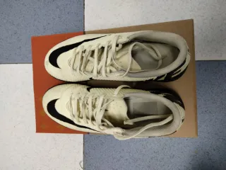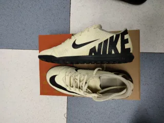 Zapatillas de fútbol Nike en excelente estado, casi nuevas. - Diseño moderno en gris con detalles amarillos. - Talla 35.5. - Ideales para césped artificial o natural.