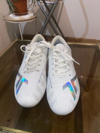 Zapatillas de fútbol con un diseño moderno y llamativo. - Parte superior blanca con detalles en azul. - Logo iridiscente en la puntera. - Cordones blancos. - Suela con tacos para césped.