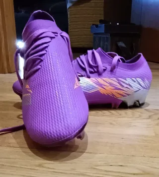 Zapatillas de fútbol con un diseño moderno y llamativo. - Exterior en color plateado con detalles en rosa. - Suela con tacos para césped. Como nuevas usada 1 ves