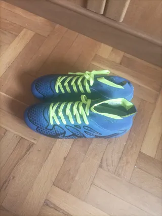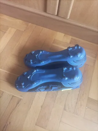 Zapatillas de fútbol Adidas y puma en color y azul amarillo, talla 38. - Diseño de caña alta. - Tiras laterales. - Suela con tacos.