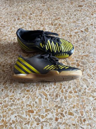 Vendo zapatillas de fútbol sala Adidas Predator para niño, originales. Color negro con detalles en amarillo, ideales para pista indoor, con muy buen agarre y control del balón. 👟 Marca: Adidas ⚽ Modelo: Predator (fútbol sala) 📏 Talla: 30 🎨 Color: Negro / Amarillo 📦 Estado: Buen estado, con signos normales de uso (ver fotos). 👦 Uso: Niño Cómodas y resistentes, perfectas para entrenamientos y partidos.
