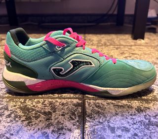 Zapatillas de fútbol sala Joma en color verde azulado y detalles en rosa. Viene con otro par de cordones verdes y su respectiva caja - Diseño deportivo. - Cierre con cordones. - Suela de goma.