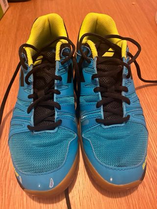 Zapatillas para deportes indoor: balonmano, squash o futbol sala. marca Babolat en talla 41. Calidad y comodidad. Tienen pequeñas marcas de uso. - Color azul y amarillo. - Cierre con cordones negros. - Suela de goma caramelo.