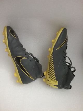 Zapatillas de fútbol Nike en talla 37.5. - Diseño en color gris con detalles en amarillo. - Cierre con cordones.