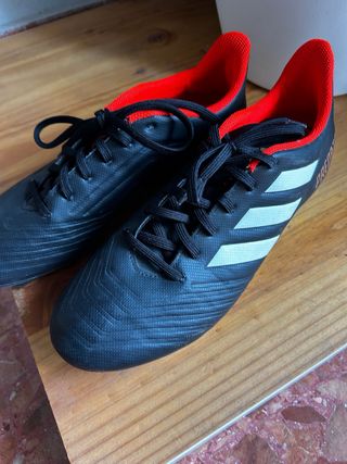 Zapatillas deportivas Adidas Predator, ideales para fútbol o rugby. Diseño moderno y cómodo. - Color negro con detalles en blanco y rojo. - Cierre con cordones negros. - Logo de Adidas en los laterales.