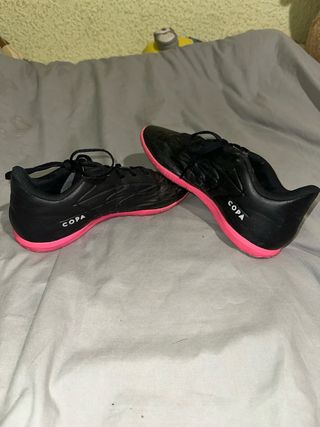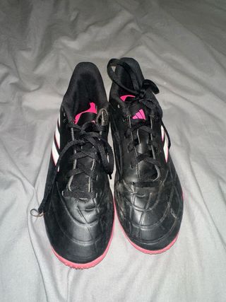 Zapatillas deportivas Adidas Copa con un diseño moderno y llamativo. - Exterior en color negro. - Detalles en color rosa vibrante. - Marca Adidas visible en el lateral.