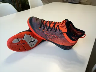 Zapatillas de fútbol sala Ginko Inviso en llamativos tonos naranja y negro. Diseñadas para un buen agarre y comodidad en la cancha. - Parte superior de malla transpirable. - Suela de goma para tracción. - Cierre con cordones. - Ligeras y comodas. - Han sido usadas solo 2 veces.