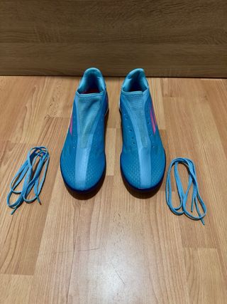 Zapatillas de fútbol Adidas X Speedflow.3 TF en llamativos tonos azules con detalles en rosa. Talla 45 1/3 - Lleva cordones pero para mi mas cómodas sin ellos. - Suela TF (Turf) para césped artificial. - Logo de Adidas en el lateral.