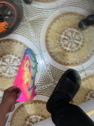 Botas de fútbol Nike Phantom con un diseño llamativo. - Combinación de colores azul y naranja. - Detalle de salpicaduras en tonos rojizos y amarillos. - Logo de Nike en los laterales. - Nombre 'Phantom' visible en la zapatilla. -ESTAN NUEVAS PUESTAS UNA VEZ SOLO.