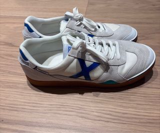 Me costaron 85€ Zapatillas de fútbol sala de la marca Munich. Combinan un diseño deportivo con detalles en azul y blanco. - Parte superior de ante y textil. - Suela de goma. - Cierre con cordones.