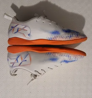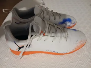 Zapatillas de fútbol Puma en color blanco con detalles en naranja y azul. - Diseño moderno y llamativo. - Suela con tacos para césped. - Logo Puma en el lateral.