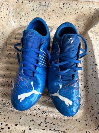 Zapatillas de fútbol para césped artificial o natural. - Color azul con detalles blancos y naranjas. - Logo de Puma en los laterales. - Cierre con cordones.