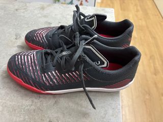 Zapatillas de fútbol sala para niño de la marca Kipsta. - Diseño con detalles en rojo y blanco. - Cierre con cordones. - Suela de goma. En una foto se aprecio lo único que tiene mal la zapa izquierda