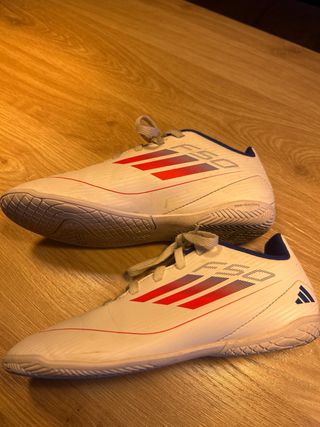 Zapatillas de fútbol sala Adidas F50. - Diseño en blanco con detalles en rojo. - Cordones blancos - Cuello y lengüeta en azul.