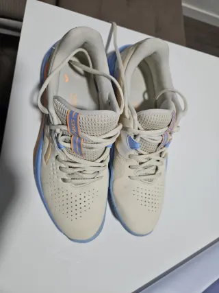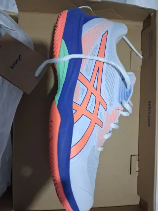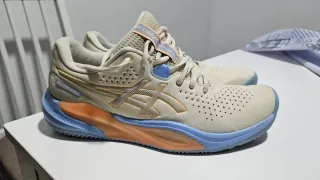 Zapatillas Asics para pádel de hombre en color beige. Diseñadas para ofrecer comodidad y rendimiento en la pista. - Parte superior de malla transpirable. - Suela de goma para un agarre óptimo. - Detalle de logo Asics en los laterales. - Cierre de cordones. Fueron utilizadas hasta dos veces, por problema en la rodilla no puedo jugar más este deporte. Estan como nuevas.
