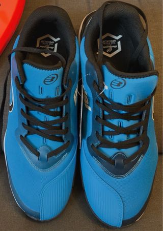 Zapatillas de pádel Joma en talla 45, con un diseño llamativo en azul y detalles en rojo. - Parte superior de malla transpirable. - Suela de goma para un buen agarre. - Cierre de cordones. 📦 Envío rápido 24-48 h. Si necesitas medidas, más fotos o información, escríbeme sin problema. 💬 Respondo rápido a ofertas.