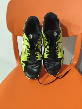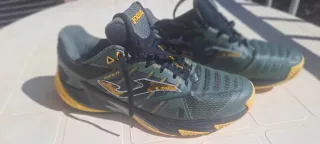 Zapatillas de pádel Joma con un diseño moderno y llamativo. Puestas tres veces las vendo, me quedan grandes - Combinación de colores negro y verde. - Detalle de estampado en la parte trasera.