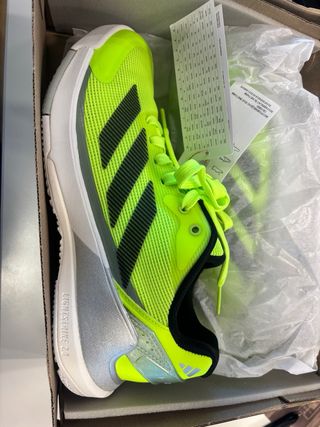 Zapatillas de pádel para mujer de la marca Adidas, sin estrenar. - Diseño moderno en gris y verde neón. - Cierre de cordones. - Suela de goma para mayor agarre.