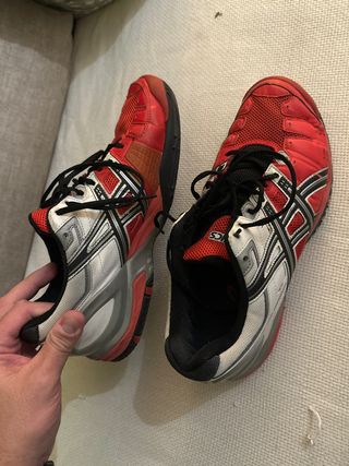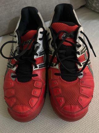 Zapatillas deportivas Asics Gel, ideales para pádel. Estan usadas un poco gastada la suela en la punta como se puede ver en la foto pero estan muy bien. - Diseño en color rojo y blanco. - Suela de goma para mayor agarre. - Cierre con cordones negros.