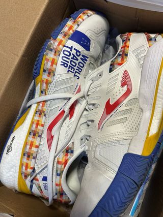 Zapatillas de pádel Joma con diseño inspirado en el World Padel Tour. Usadas en una sola ocasión. Están IMPOLUTAS. Sin arañazos, golpes ni desgaste de la suela: - Color blanco con detalles a cuadros multicolores. - Logo de Joma en rojo. - Inscripción World Padel Tour en los laterales. - Suela con tecnología Reactive Ball.