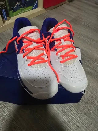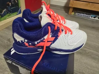 Zapatillas de pádel o tenis Babolat en talla 38.5. Diseñadas para ofrecer comodidad y rendimiento en la pista. Totalmente nuevas en su caja. - Combinación de colores blanco y naranja. - Detalles en azul. - Suela con diseño específico para pádel.