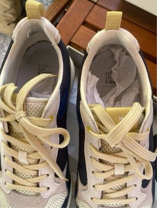 Zapatillas de la marca Hoff en talla 44. Combinan tonos beige y azul para un estilo moderno. - Diseño deportivo. - Cierre con cordones.