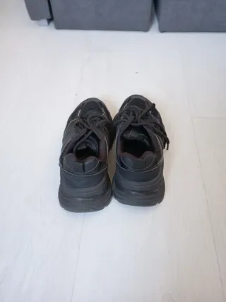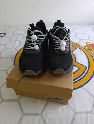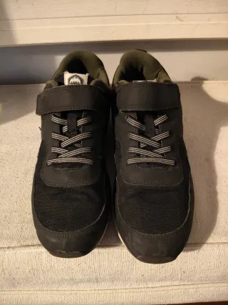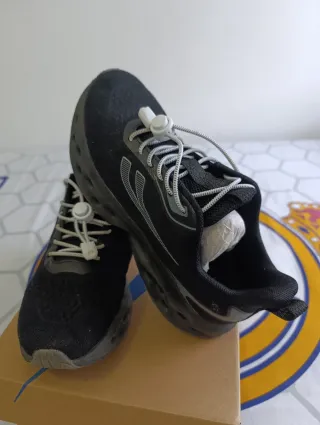Zapatillas deportivas negras, talla 39, a estrenar. - Cierre con cordones blancos. - Suela de goma con detalles. - Diseño moderno.