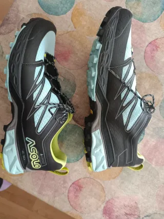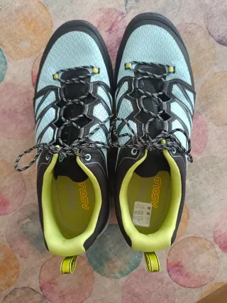 Zapatillas de montaña Asolo en color azul y negro. Perfectas para senderismo y actividades al aire libre. - Cierre con cordones. - Suela de goma. - Diseño deportivo. Un solo uso de 30 minutos. Se venden por número pequeño.