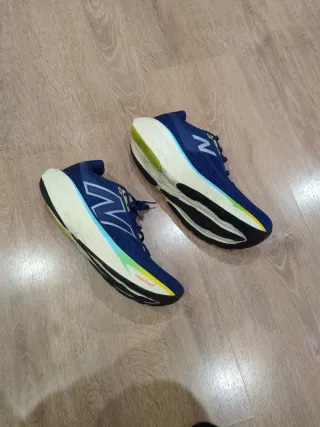 Zapatillas de trail running New Balance MTHIERD5, nuevas a estrenar. - Color principal azul con detalles en verde lima y negro. - Suela Vibram para un agarre óptimo. - Tecnología Fresh Foam X para máxima amortiguación. - Protección Toe Protect en la puntera.