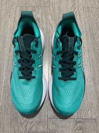 Zapatillas deportivas Asics Gel Nimbus 27 en color verde azulado y blanco. Muy poco uso, solo un par de carreras, para probarlas. Se vende por error al coger la talla.