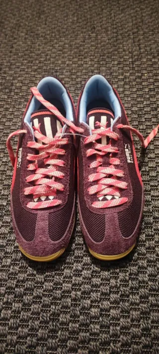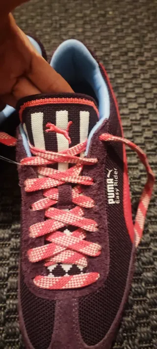 Zapatillas deportivas Puma Easy Rider en color morado y detalles en rosa. Me costaron 110€. - Diseño deportivo. - Cierre con cordones. - Logo de Puma en la lengüeta y lateral.