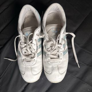 Zapatillas deportivas Adidas de piel en color blanco con detalles en azul. - Diseño vintage. - Cierre con cordones.