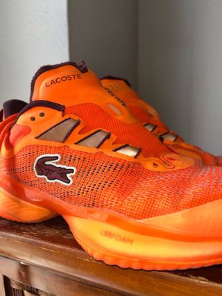 Zapatilla deportiva de la marca Lacoste en llamativo color naranja. Diseñada para ofrecer comodidad y estilo. - Logo de Lacoste en el lateral. - Detalle en color burdeos en el talón y cuello. - Malla transpirable en la parte superior.