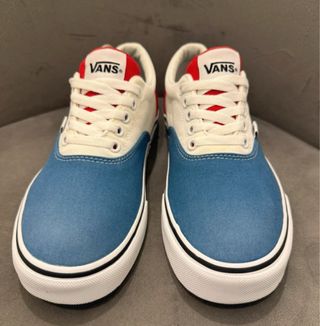 Zapatillas deportivas Vans Off The Wall con un diseño llamativo y moderno. - Combinación de colores azul, blanco y rojo. - Logo de Vans en la lengüeta y el talón.
