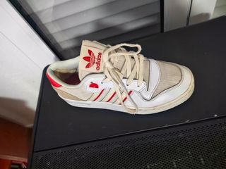 Zapatillas deportivas Adidas con un diseño clásico y detalles en rojo. - Combinación de materiales en blanco y beige. - Tiras laterales icónicas en rojo. - Detalle rojo en el talón. - Cordones de color crema. La zapatilla tiene un detalle en el talon se le coloco una almohadilla para que el talón no haga roce, como se muestra en la imagen , el material de la zapatilla no tiene defectos .