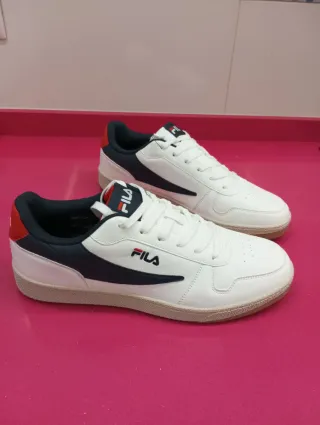 Zapatillas deportivas de la marca Fila con un diseño moderno. - Combinación de colores blanco y azul marino. - Detalle en color rojo en el talón. - Suela de goma resistente. - Nuevas a estrenar no se a usado - No quedó presencial solo envio